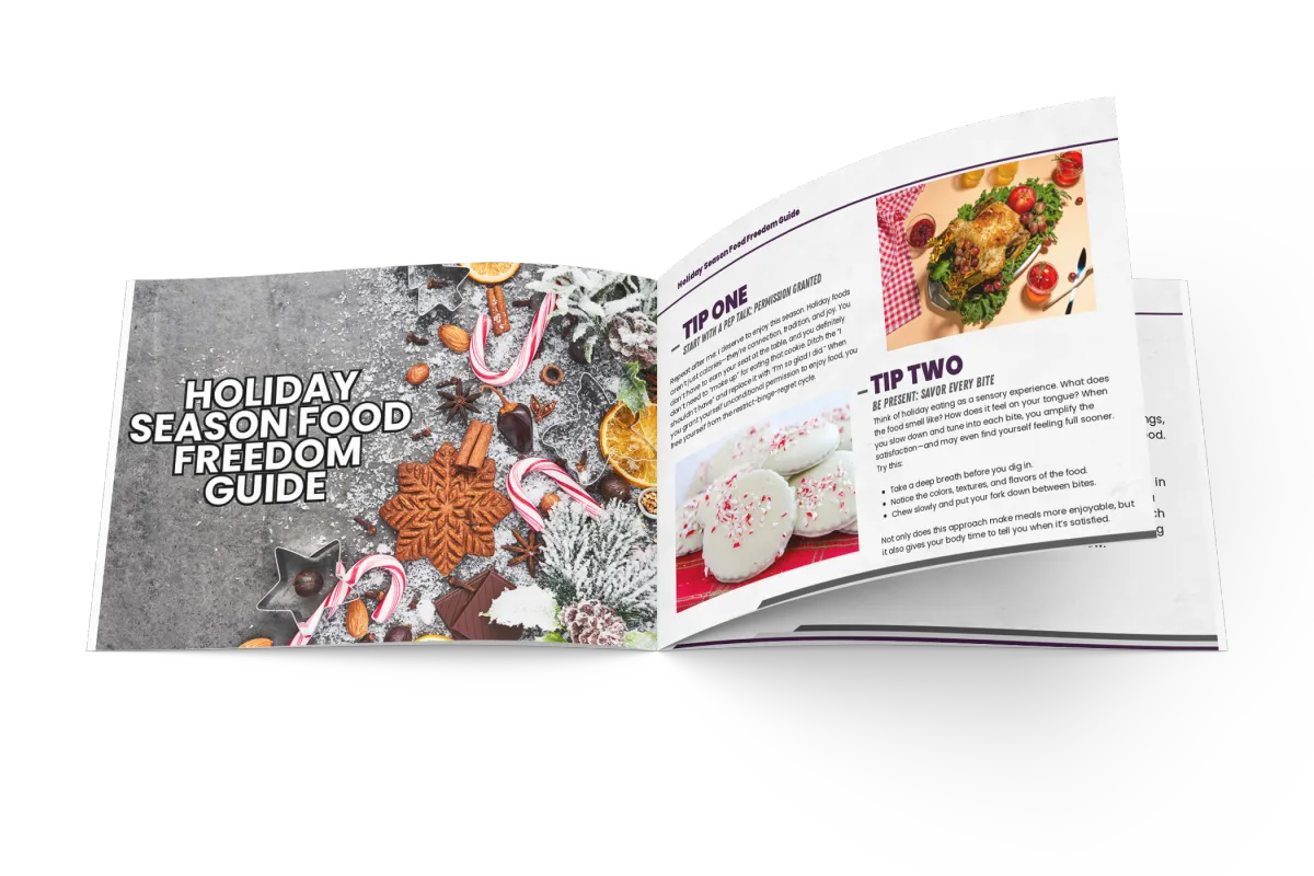 Holiday food, minus the guilt. This Food Freedom Guide helps you ditch calorie math, handle parties and comments, and eat with confidence, not “starting over Monday.”